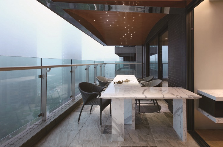 「看海的露台採固定石材長桌會所,天花板鏡面點狀的燈光,讓室內外滿天星斗的;石桌至孩房成了書桌,延伸一致的設計語彙與實用互動。」讓這個房子的最佳VIEW,提升生活的價值感,更具吸引力。