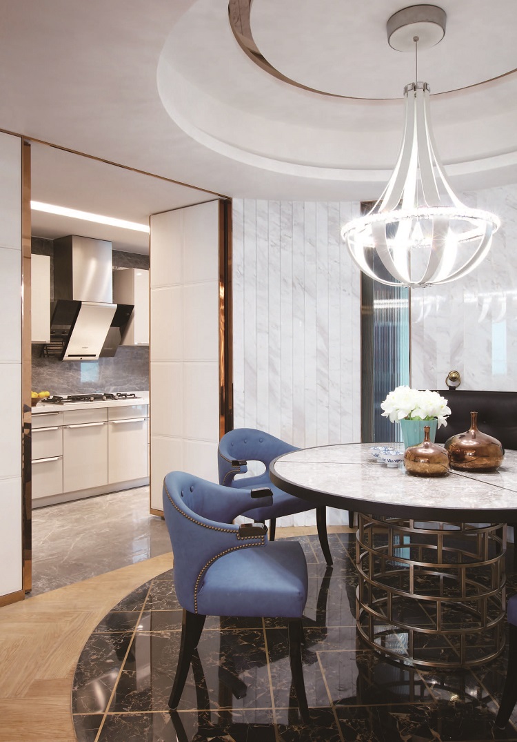 印象中的客廳電視牆總是一整面石材,好像變成一個標準配備。「越是理所當然,越是設計的可能性。」在呂世民設計師眼裡,他習慣把顛覆理所當然這件事看作是設計的一個契機。原來是方形格局的餐廳,在呂世民設計下,幻化成圓的聚氣美學空間,一道完美弧形拼接層次的石材牆,阻隔後陽台不佳的視覺,毛玻璃導引光線進入餐廳,圓桌,施華洛世奇的水晶吊燈,視覺呈現完全不可預期的經驗,令業主十分認同,又一驚艷。