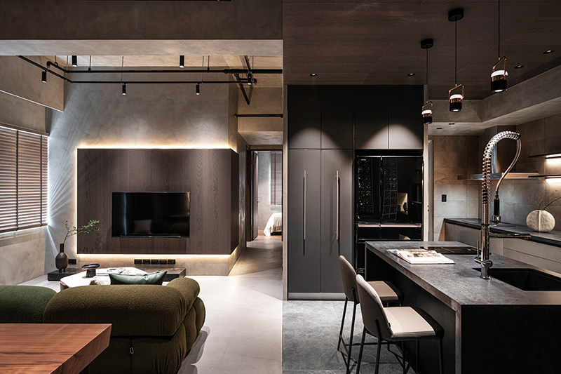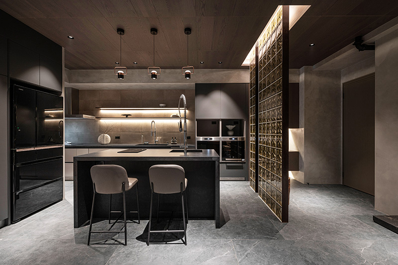 軟質的吧檯椅與茶色玻璃屏風平衡了廚房的冷冽感。