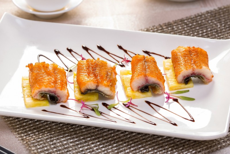 廣東話中稱鰻魚為鱔,主廚取整尾鰻魚,剔除魚背骨與腸肚後,留下魚身肉,放在叉燒醬中醃製入味後沖水洗淨,泡在薑與米酒中去腥,拿起後吊掛風乾,經過反覆淋油上色塑型,食材下方鋪陳清爽鳳梨,再淋畫上檸檬蜜醬汁。入口可感受到魚的甜蜜脆口,檸檬香卻又適時調和提鮮,鳳梨也增添清爽,脆鱔愈嚼愈香,甜膩中帶有酸香滋味讓人停不下口