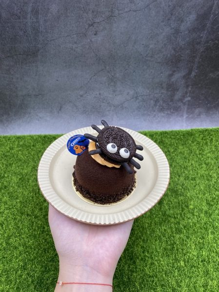 蜘蛛也能很可愛!以OREO 香草口味夾心餅乾當做身體,搭配八腳巧克力,活靈活現地趴伏在蛋糕上,蛋糕是草莓慕斯配著香草慕斯,酸酸甜甜的口感,吸睛特別的外型,每一口都超有萬聖節氛圍!