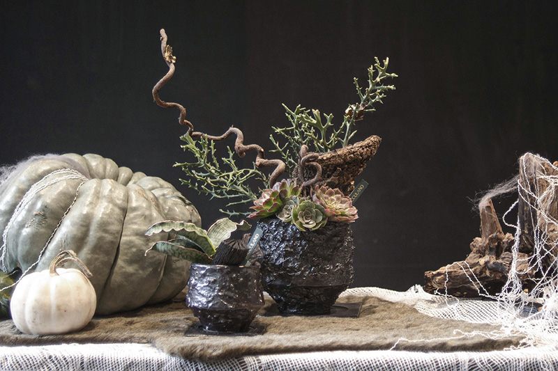 首先要選擇桌面上的主角,凸顯其特色,讓你自己或客人們看到這件藝術品的價值存在。作為植物店,我們挑選的盆器陶盆,外觀釉藥表現似黑色泥漿,凹凸不平的紋理馬上讓我們聯想到南瓜的表面,還有斑駁、剝落的樣態,也很容易與萬聖節的印象連結。