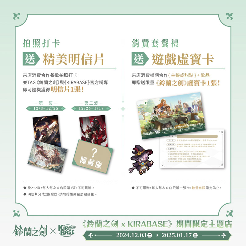 全台規格最高的動漫主題餐廳KIRABASE,與人氣SRPG手遊《鈴蘭之劍》展開跨界合作,自2024年12月3日至2025年1月17日止,於台北三創基地展開為期1.5個月的《鈴蘭之劍》期間限定主題店。