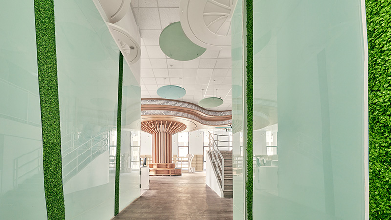 入口處彷彿穿過蜿蜒小徑,兩旁的樹幹及天花板上的樹叢意象,帶領訪客穿越入口的綠色林道,進入圖書森林區。