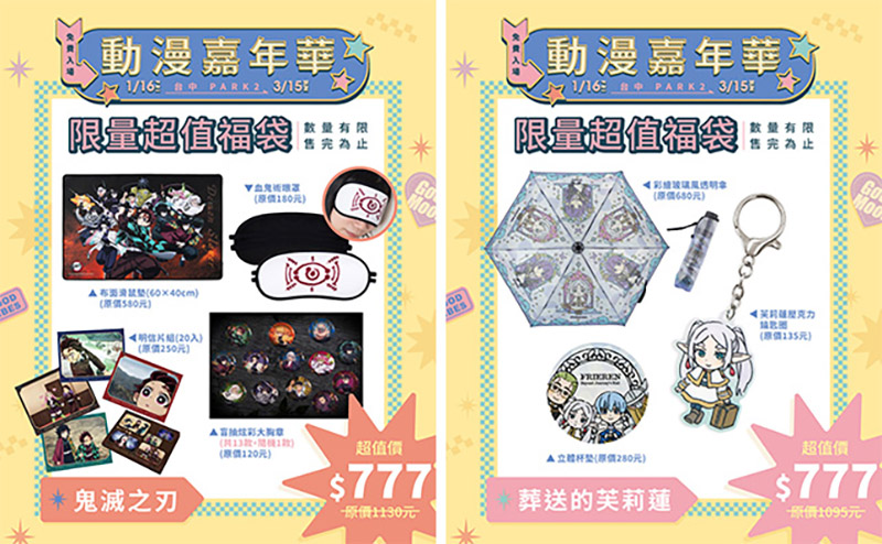 木棉花與宅一番精心推出超值福袋,內含多款精選實用周邊與收藏商品,每袋只要777元,身為粉絲絕對不能錯過!《進擊的巨人》福袋推出調查兵團刺繡托特包及角色人物書籤收藏組。《鬼滅之刃》福袋收錄角色滑鼠墊與血鬼術眼罩。《膽大黨》福袋則帶來超可愛的高速婆婆頸枕組。《葬送的芙莉蓮》福袋推出彩繪玻璃風格折疊透明傘。《WIND BREAKER—防風少年—》福袋推出櫻遙造型公仔存錢筒。《關於我轉生變成史萊姆這檔事》福袋則收錄造型隨身收納環保袋。每款福袋數量有限,售完為止!。無法親臨現場的粉絲,也可透過木棉花樂園官方購物網站、木棉花蝦皮商城,以及木棉花門市同步搶購部分福袋(實際販售款式依各平台與門市公告為準)。