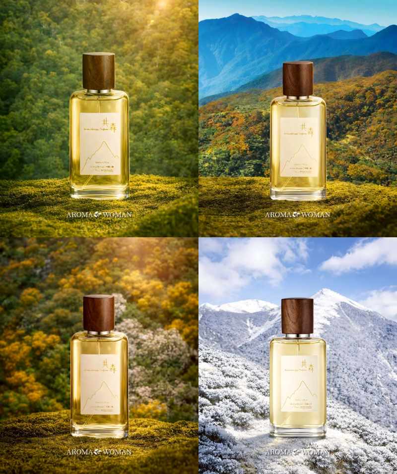 系列涵蓋:春-晨曦森語、夏-林間流光、秋-暮秋靜謐與冬-霧隱山嵐四款。林諗慈運用台灣特有紅檜、黃檜與肖楠,搭配各海拔花卉,打造出具自然底蘊且充滿時尚感的質感芬芳。