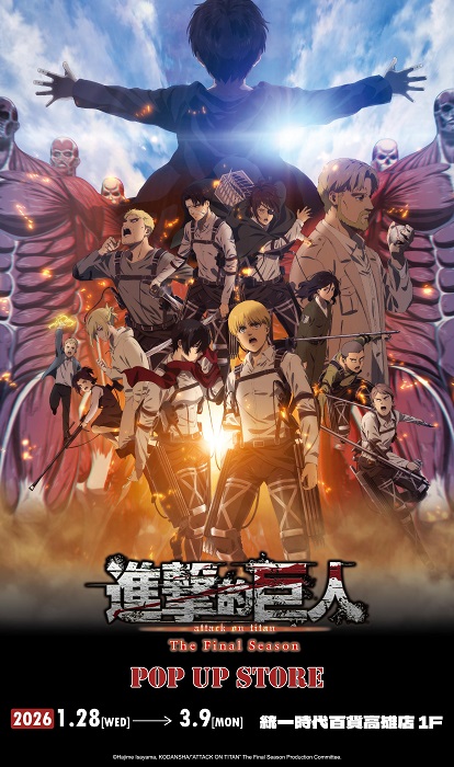 進擊的巨人粉絲們集合啦!《進擊的巨人:The Final Season》快閃店1/28-3/9在統一時代百貨高雄店登場!四大拍照打卡點首推一到店就會被帥到,集結米卡莎、里維及約翰等主要角色的「天與地之戰」,還有紅磚牆前「米卡莎與阿爾敏」櫥窗區,讓人想起全力奮鬥為自由而戰的感動畫面,最後別忘了留點時間看著「經典回顧牆」,細細回憶調查兵團成員們聯手對抗世界末日的最終戰!快閃店更推出超過六十款全新週邊商品,從身穿帥氣西裝系列的兩款艾連和里維「旋轉立牌」買起,再到一次擁有線條圖和全彩圖的「抽拉票根吊飾」,最後不能錯過可愛到發瘋的迷你「絨毛披風吊飾」與共有七款的「盲抽劇場彩蛋小立牌」,好想抽到里維兵長手持清潔用品的那款呀!