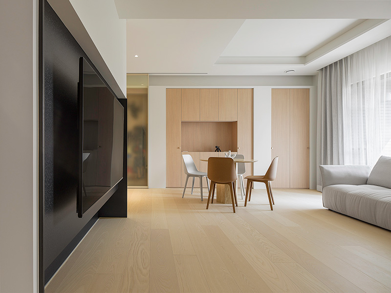 以屋主姓名中的「言」與「亭」為靈感,以留白搭配溫潤木質做為主調,讓空間在克制中保留柔軟。在80平方公尺的新成屋裡,透過格局重整與動線梳理,讓光線、收納與起居軸線連成一氣,生活被寫成一句流暢而有節奏的長句。