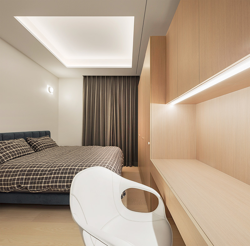 主臥以深色床架穩定視覺,木質收納與書桌沿一側牆面延展,線性燈條嵌於櫃下,提供柔和且集中的工作照明。