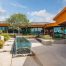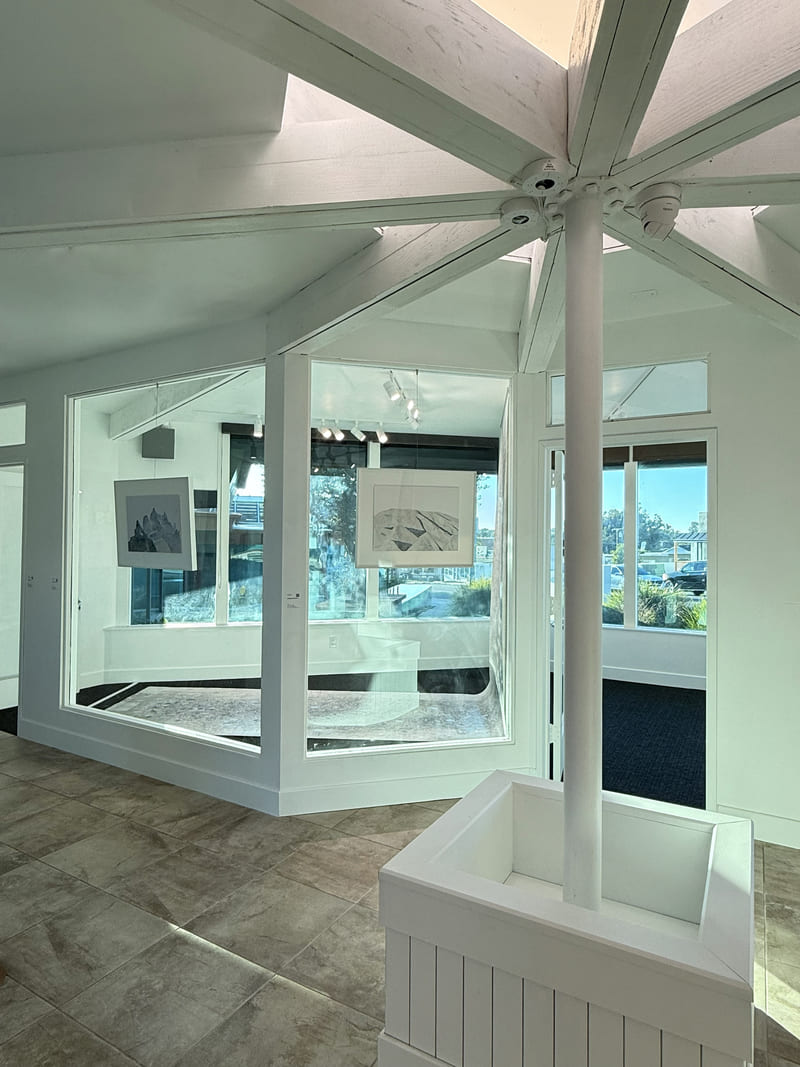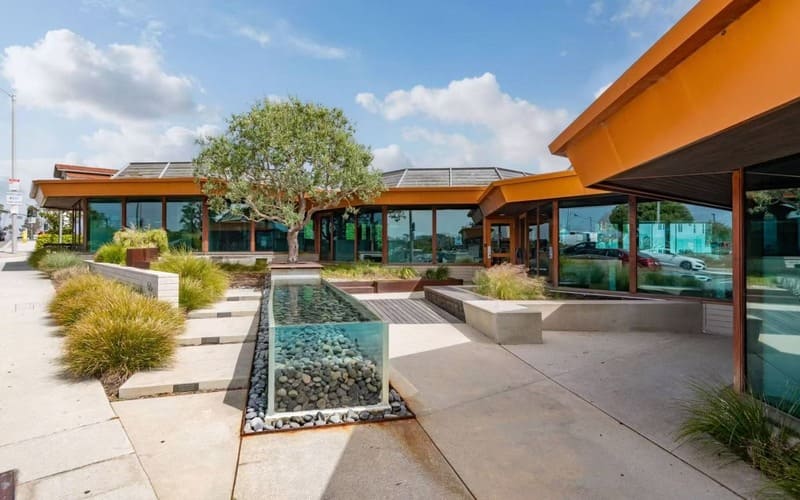 Bluerider ART LA•Manhattan Beach 新館佔地約 15,000 平方英呎,由建築師 John Merrill Gray 設計,原建於 1953 年,是中世紀現代主義的代表建築之一。整體以四棟多面體結構環繞中庭花園與 7 米長水池構成,運用大面積玻璃引入自然光線,模糊室內外界限。