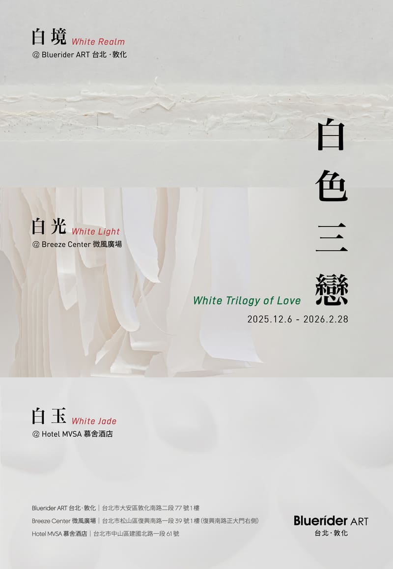 Bluerider ART 台北·敦化將於 2025 年 12 月 6 日至 2026 年 2 月 28 日 推出年度冬季策展計畫 《白色三戀 White Trilogy of Love》。本次以「白」為核心概念,展出以「紙」的創作藝術,於台北三大場域同步推出三檔展覽,打造冬季城市藝術亮點,包括: