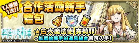 購買「動畫《葬送的芙莉蓮》第2彈 合作活動新手禮包」,就能以運氣5&等級「極」&「+值」MAX狀態獲得「大魔法使 賽莉耶(★6)」。此外,還能獲得任選鈴及體力罐等推薦給新手的道具組合!「大魔法使 賽莉耶」只能透過合作活動新手禮包入手,每人限購1次!