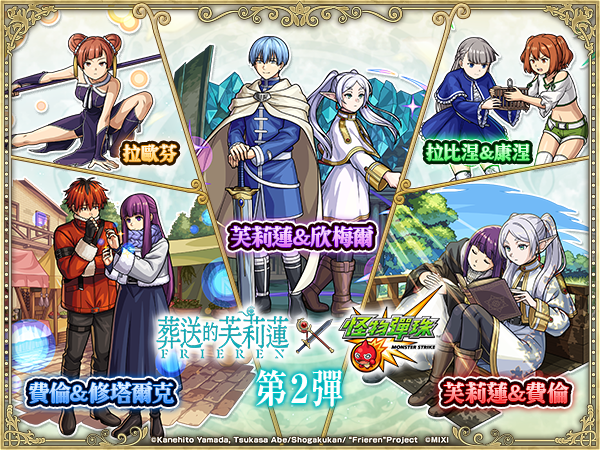 在本合作活動中,「芙莉蓮&欣梅爾」「芙莉蓮&費倫」「費倫&修塔爾克」「拉比涅&康涅」「拉歐芬」將在期間限定轉蛋中登場。獸神化後的角色們完美復刻動畫經典名場面,帶給玩家身歷其境的視覺饗宴!而第1彈合作活動中登場過的「芙莉蓮」「費倫」「修塔爾克」獸神化・改也將解禁。氣場全開的造型充滿魄力,第1彈合作中沒有抽到他們的彈珠好手們不要錯過這個機會喔!