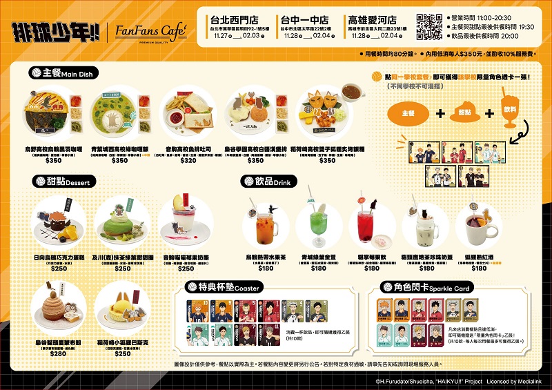 FANFANS CAFE 宣布推出《排球少年!!》主題咖啡廳,於 11 月 27 日正式開幕。本次合作以動畫中五大人氣高校為設計主軸,透過場景布置與系列主題餐點,打造高度沉浸的青春賽場氛圍,邀請粉絲一同走入《排球少年!!》的熱血世界。
