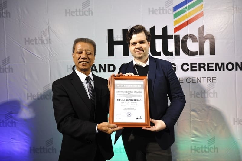 由 Hettich 亞太區副總裁 Alex 頒發Hettich授權證書與德誠實業董事長 胡宸華先生( 圖/Hettich 提供 )