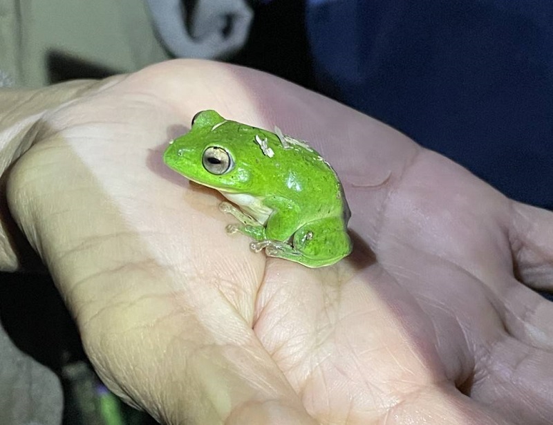 老師帶領大家靜靜走在步道上,手電筒的光點落在葉片上、落在水面上,也落在悄然活動的夜行生物身上。螢火蟲在黑暗中一閃一閃,像微小的星辰落入濕地。大家都不自覺放輕腳步、壓低聲音,彷彿被這片土地的夜語所包覆。