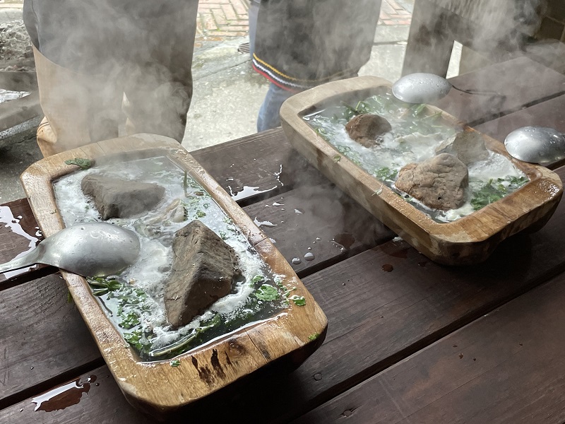 午餐是原民文化中極具代表性的「石頭火鍋」。蛇紋石被燒得滾熱後投入竹筒中,與水產生急速的熱騰反應,細細的煙霧在竹筒口上升起,香氣隨之蔓延開來。食材在石頭的溫度中慢慢釋放風味,竹筒中湯的顏色逐漸變深,像是把整座山林的味道悉數煮進其中。