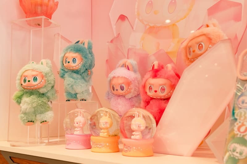 門市設計以明亮大器為基調,融合木質元素與燈光線條,帶出簡約質感。店內特設「THE MONSTERS毛絨牆柱」,以巨型樹幹為靈感,搭配森林意象小屋與松樹裝飾,營造奇幻氛圍。展示平台排列LABUBU與THE MONSTERS系列角色,彷彿置身童話森林。另有「CRYBABY愛神的眼淚系列-甜在一起」與「小手拉小手系列-只看得見你」的大型裝置,打造必拍打卡點。