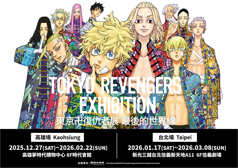 眾多東卍迷引頸期盼的《TOKYO卍REVENGERS EXHIBITION 東京卍復仇者展 最後的世界線》台灣首展,即將於12/27在高雄夢時代購物中心開展,並於2026/1/17於新光三越台北信義新天地A11舉行第二場展覽。首先登場的高雄場預售票將於11/24開賣,推出以2種展覽主視覺為設計的限定特典,以華麗彩色主視覺呈現的壓克力板畫及燙金圖卡,另一種以俐落印象的黑白主視覺設計的壓克力板畫及燙銀圖卡,兩種不同風格的「東卍」魅力,絕對值得每位粉絲珍藏,限定票數量有限售完為止。台北場預售票資訊將於12月上旬公開,敬請期待。