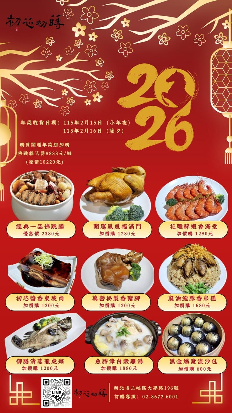 今年年菜主打得獎的「麻油鮑豚飯」,並搭配店內推出的經典「一品佛跳牆」。餐廳規劃「年菜+佛跳牆」組合優惠價新台幣8888元,主打以一桌價完成春節圍爐所需菜色,適合三峽、樹林、鶯歌、土城一帶家庭及企業訂購。實際菜單內容、預購方式與取餐時間,依餐廳現場與官網公告為準。