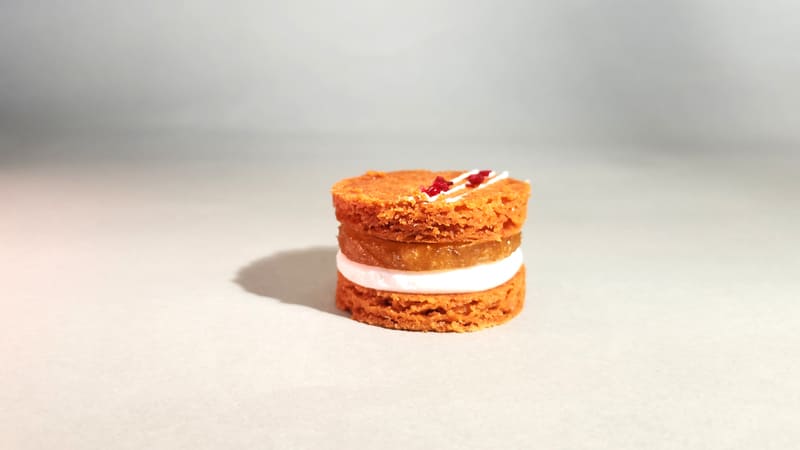 維格餅家獲獎作品「蔓越莓鳳梨S’MORE」,靈感源自北美露營甜點S’more團隊將象徵「團結分享」的童軍營火甜點,轉化為融合東西風味的水果夾心酥餅,期盼透過伴手禮傳遞溫暖情感與祝福這款夾心餅採用極具挑戰性的「5層結構設計」