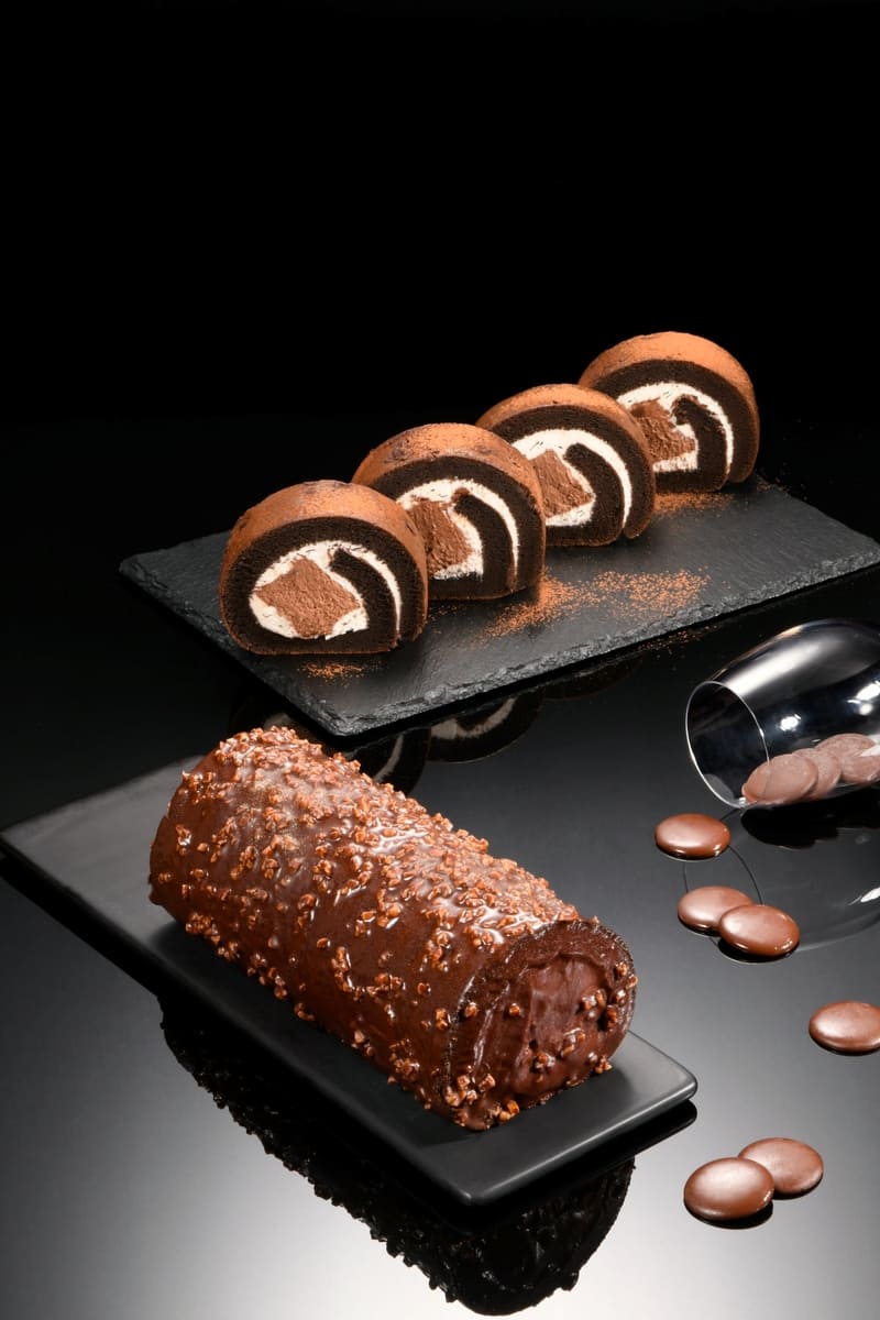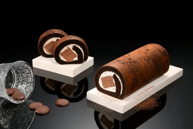 同場加映「厄瓜多爾黑巧克力生乳捲」特黑巧克力泡芙蛋糕鑲嵌珍貴無比的71%厄瓜多爾黑巧克力碎片,點綴上細緻的貝可拉可可粉一起烘烤,搭配清爽的北海道奶霜與厄瓜多爾黑巧克力慕斯,溫潤中帶有醇厚、濃重的可可底蘊,純粹中感受巧克力的悠長餘韻。