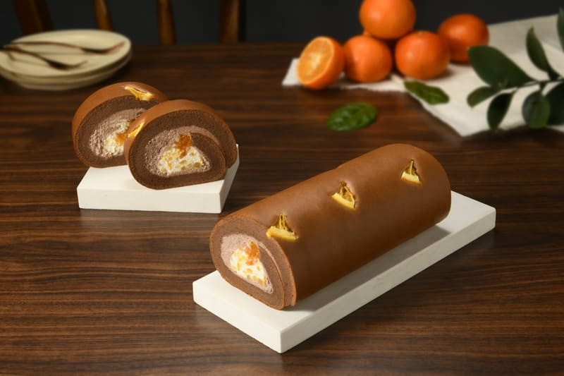 濟州橘風巧克力生乳捲以亞尼克招牌泡芙蛋糕為基底,加入比利時貝可拉可可粉與柑橘蜂蜜茶調和,外層點綴橙片增添香氣層次,內餡則融合可可奶霜與柑橘奶霜,並搭配柑橘凍、橘瓣與四季桔果泥等元素,呈現多層次口感變化。整體風味以溫潤不膩為主軸,展現柑橘的清新酸香與巧克力的厚實風味,成為年節送禮與自享甜點的新選擇。